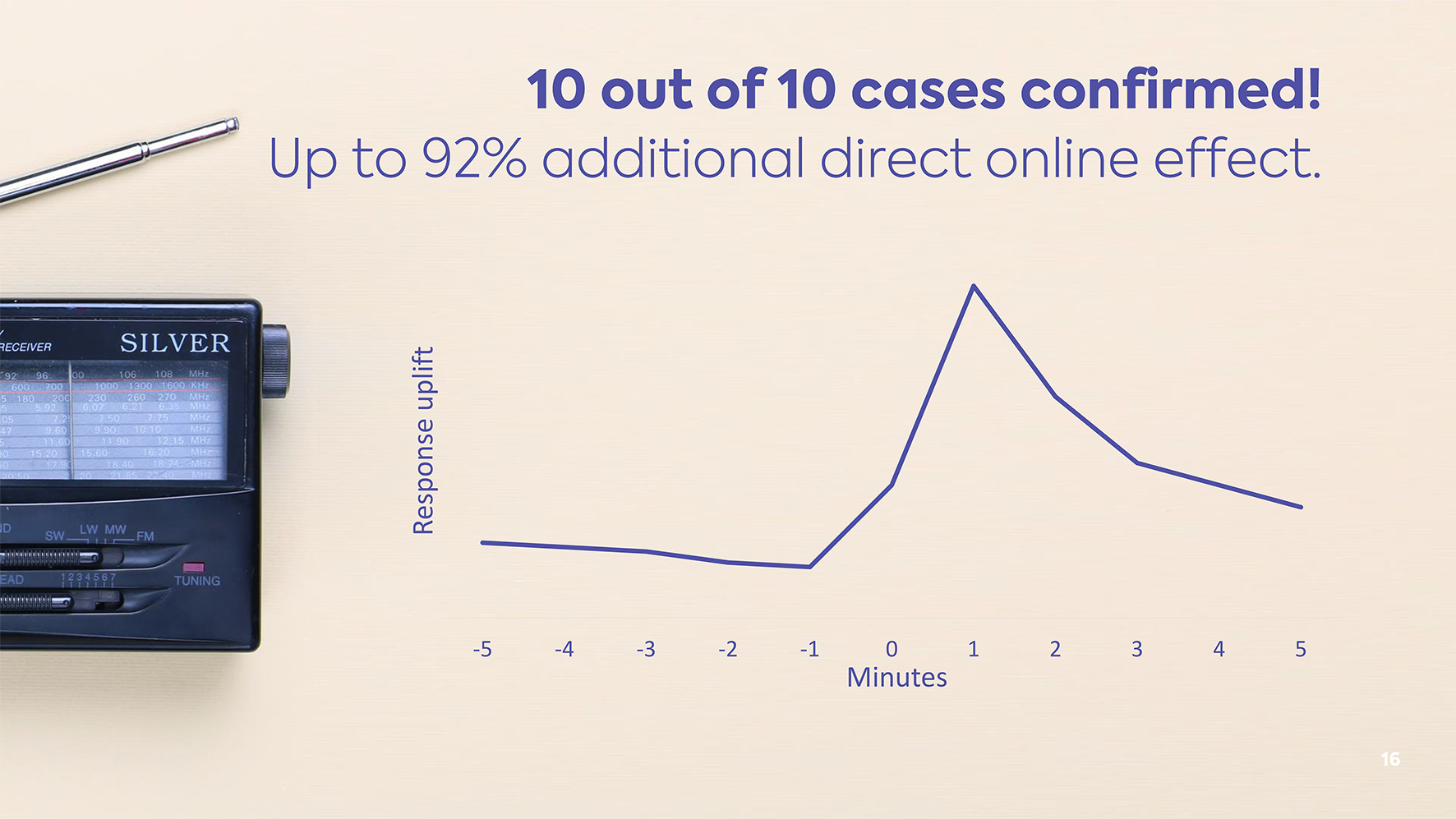 To prove this methodology, Talpa did a test study with 10 clients. All of their campaigns consisted of two weeks of radio advertising, one week off in which an analysis was conducted, followed by 2-4 weeks of optimised radio airing. The results confirmed in all 10 cases that radio generated a substantial direct response – up to 92% of additional direct response uplift.